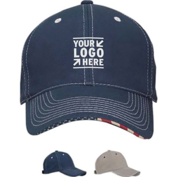 Patriotic CapProduct name : Patriotic Cap Item : TP3248 Gain some free marketing when your logo's imprinted on our patriotic cap! Features cotton twill with a stars and stripes pattern print on the sandwich visor, a small USA flag attached to the adjustable hook and loop closure and a 3.25" crown. Great for colleges, fundraisers, and the travel industry. Show pride in your school and country with this personalized accessory. A nice addition for any outdoor sporting event or holiday cookout!Product color: KHAKI, Navy Imprint method: embroidery Location: Price only include one color imprint on one location and freight cost to door Production lead time 25 days Price details