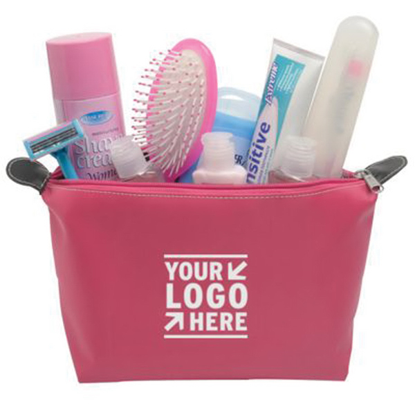 Toiletry BagProduct name : Toiletry Bag Item : TP3227 The Diva (TM) Toiletry Bag provides you with an ideal promotional gift for frequent business travelers. This 6 1/4" H x 11 1/2" x W x 4 3/8" D bag with sponge polyester construction with black leather accents features top zipper closure and zipper pocket on backside. Plus, there's plenty of room for an imprinted message or logo. A useful travel item, the Diva Toiletry Bag is terrific for travel agencies, resorts, hotels and cruises.material: Polyester-Leather Product color: Blue, Lime, Orange, Pink Imprint method:Silkscreen Location: Price only include one color imprint on one location and freight cost to door Production lead time 25 days Price details
